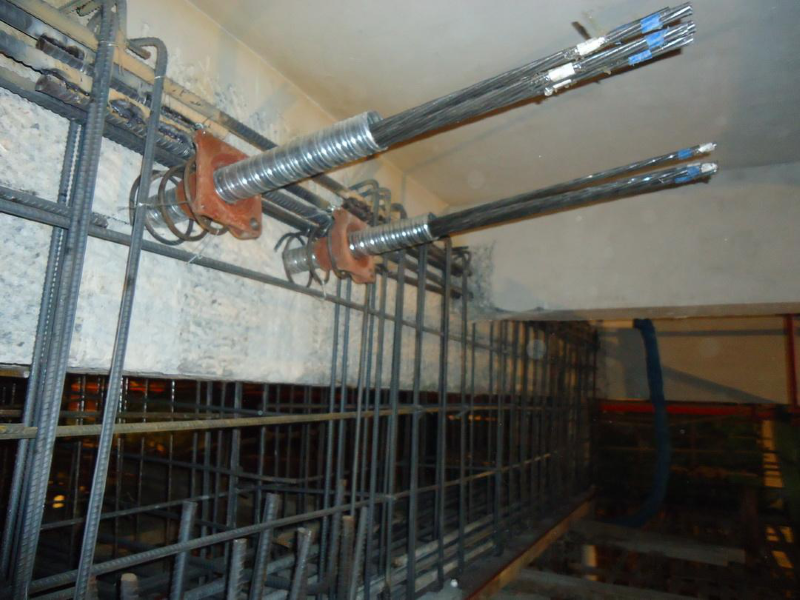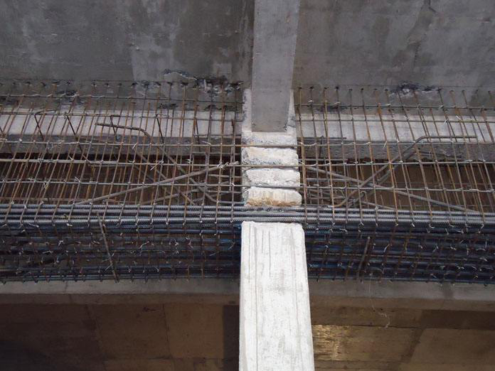 托梁拔柱設(shè)計構(gòu)造,對于設(shè)置托梁方案,托架兩端在旁柱上的支承固定,一般是采用現(xiàn)制牛腿來實現(xiàn),旁柱上端若為薄壁工字形載面時,也可直接開鑿孔洞支承。牛腿中的鋼筋一般是采用索安卡化學(xué)植筋技術(shù)在鋼筋混凝土柱上生根,柱應(yīng)局部鑿去保護層。若采用外包封閉式鋼板套箍的抗剪能力,套箍應(yīng)與柱主筋焊接,或者附加預(yù)應(yīng)力螺栓或打孔穿入方鋼銷等。當為鋼柱時,牛腿與柱可直接焊接。對于無支撐托梁拆墻,一般是采用雙面鋼筋網(wǎng)混凝土夾板墻對原上部(磚)墻加固,再與托梁組合為一根墻梁,以增大抗彎剛度,且在梁中配置定量的后張預(yù)應(yīng)力筋,利用預(yù)應(yīng)力時的反拱來抵消拆墻后的部分撓曲變形。